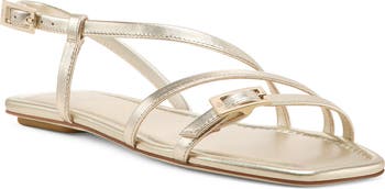 Metallic leather straps bring understated glamour to a breezy slingback sandal grounded by a walkable flat sole.