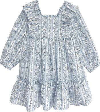 The Georgina Dress brings timeless elegance to your little one?s wardrobe. Crafted from soft, lightweight fabric, it combines a light blue and white vertical stripe pattern with intricate floral designs. A square neckline, long sleeves, and ruffled shoulders create a refined silhouette, while the tiered, gathered skirt adds playful volume. Perfect for twirling, this dress effortlessly blends vintage-inspired charm with modern comfort. Fabric Content & Care 65% VISCOSE 35% POLYESTER Machine Wash Cold | Line Dry | Do Not Bleach