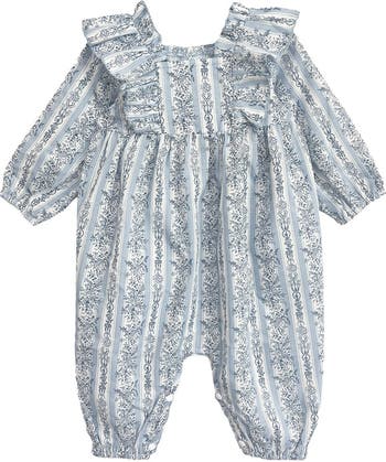 - Delightfully designed for your little one, the Georgina Romper combines timeless elegance with everyday comfort. Made of soft, breathable fabric, this delicate piece showcases a mix of light blue and white vertical stripes interwoven with intricate floral patterns. Ruffled accents along the neckline and shoulders add a touch of sweetness, while elasticated cuffs and a gathered waist ensure a snug yet playful fit. Perfect for carefree moments and treasured memories alike! Fabric Care Machine Wash Cold