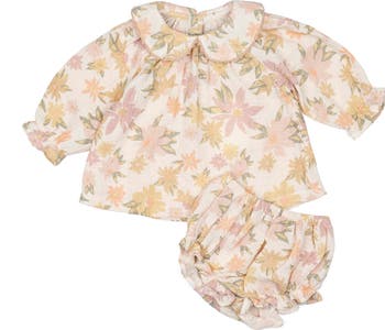 Two-piece set in soft 100% cotton gauze, featuring a Peter Pan collar with crochet trim, elastic puff sleeves, and easy pull-on bloomers. Made in Peru with love.