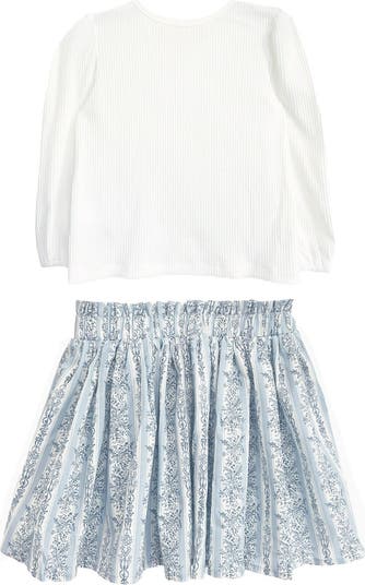 - The Georgina two piece set for girls blends timeless elegance with everyday wearability. The ribbed, long-sleeved white top offers a sweet look, while the blue-striped skirt is adorned with delicate floral accents and features a sweetly gathered waistband for added volume and charm. Together, this set shows effortless sophistication, perfect for bringing a touch of refinement to any outing or celebration. Fabric Content & Care 65% VISCOSE 35% POLYESTER Machine Wash Cold