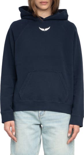 Glittering crystals bring edgy glamour to this traditionally casual hoodie crafted from a soft cotton blend and framed by sporty raglan sleeves.
