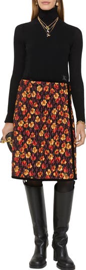 A quilted skirt made in Italy from glossy nylon with contrasting corduroy trims. Reworking an Edwardian-era pattern, the geranium print is a celebration of the British garden flower. The A-line style debuted on the Burberry Winter 2025 runway.||Press-stud closure|Metal Equestrian Knight Design at hem
