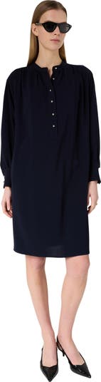 A shirt dress that skims the silhouette, cinched waist and mandarin collar create a sleek profile, soft drape for seamless office to evening transition