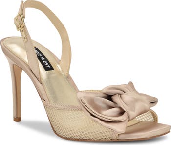 A knotted bow decorates the mesh toe of an event-ready sandal lofted by a tall, tapered heel.