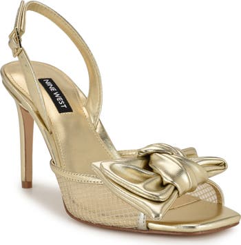 A knotted bow decorates the mesh toe of an event-ready sandal lofted by a tall, tapered heel.