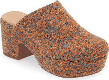 Make a statement in this chunky platform clog covered in colorful bouclé or two-toned houndstooth.