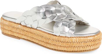 Braided straps crisscross over the vamp of a lofty slide sandal set on a raffia-wrapped platform for trend-savvy appeal.