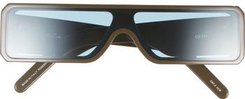Sleek acetate frames in a slim rectangular silhouette with wide temples define these statement-making shield sunglasses.