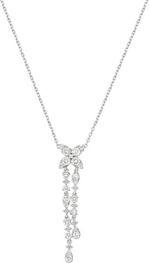 Slender strands of shimmering links cascade from the petals of a flower-shaped diamond pendant blooming brightly on a necklace made of icy 18-karat gold. Crafted with 22 mixed stones, it makes a dazzling accent to an everyday look and a brilliant focal point for an evening ensemble.