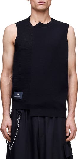 Showcasing the rebellious spirit and progressive design ethos of the brand, this lightweight sweater-vest features notches at the crewneck, an off-kilter hem and fringed 3-stripes for a stand-out look.