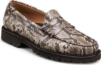 Snakeskin-embossed leather adds a sophisticated twist to this lug-sole loafer handcrafted with a moc toe and polished penny keeper.
