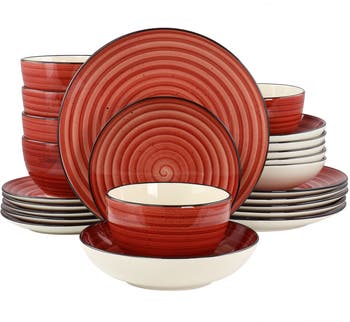 Adding a pop of color to the dinner table, Elama Gia 24 Piece Stoneware Dinnerware Set is hand painted with swirl and speckle design, bringing a unique style to your table setting. Ideal for casual lunches and intimate dinners, this set has a classic round shape, strong colored trim and two toned with White. Conveniently stackable pieces can be stored away easily and neatly in compact spaces. Conveniently dishwasher and microwave safe.