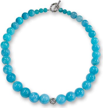 Radiating tranquil elegance, this statement necklace showcases the natural beauty of vibrant blue Amazonite gemstones. Its minimalist design features smooth, polished beads, each uniquely patterned by nature,enhanced with gleaming silver-tone spacers for a touch of refinement. Secured with a stylish toggle clasp, the necklace drapes gracefully along the neckline, offering both comfort and sophistication. Known as the Stone of Courage and Harmony, Amazonite is believed to inspire balance, calm, and positive energy, making this piece not only a striking style statement but also a meaningful treasure to cherish. This necklace is available in two bead sizes: 12mm and 10mm, and comes with matching earrings.