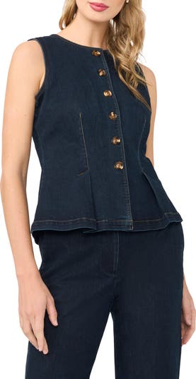 A suiting vest made from stretchy denim in a dark rinse is made with vertical seams that flare out into a peplum hem.