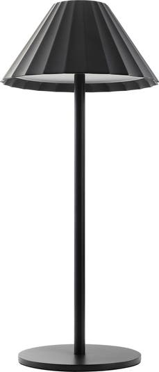 Add a charming glow to your space with this dimmable, battery-operated table lamp featuring sleek lines, a pleated lampshade and a matte-black finish. Turn it on and off with a simple tap.