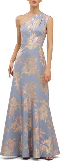 Turn heads in this glamorous mermaid gown designed in a shoulder-baring, one-shoulder silhouette and covered in lustrous metallic-jacquard blooms.
