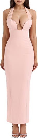 Give your curves and décolletage their due attention in this striking gown with a plunging halter bodice designed for braless wear and an utterly beguiling look.