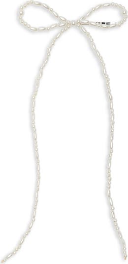 Luminous light with shine from your tresses when you wear this chic hair pin that secures a slim bow made of glossy faux pearls.