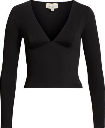 A deeply dipped neckline fronts this shapely stretch-kissed top that's destined for date night.