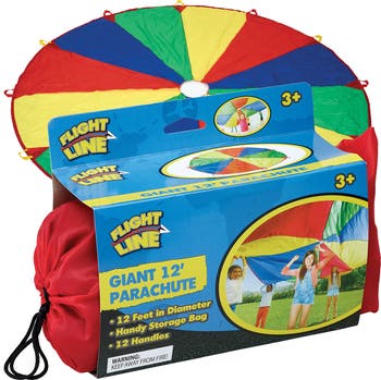 FLIGHT LINE: GIANT 12' PARACHUTE - The Flight Line Giant 12' Parachute brings big fun and active play to kids ages 3 and up with its vibrant design and endless game possibilities. Crafted from high-quality T190 polyester fabric, this durable parachute features 12 easy-grip handles and a central air vent, making it perfect for both indoor and outdoor group activities. Kids can boost their agility, coordination, and muscle strength while learning teamwork and cooperation through exciting games like POPCORN—where beanbags or balls bounce like popcorn when the chute is shaken, MAKING WAVES—with small or large ripple movements, and MERRY-GO-ROUND—where children walk, skip, or hop in a circle while holding the chute with one hand. There’s also SWITCH—a quick-action game where kids run to change places based on called-out ages, colors, or birthdays, and MUSHROOM—where lifting the chute overhead and crouching creates a magical dome. The parachute’s bold primary colors (green, red, yellow, and blue) make it visually exciting, and it doubles as a fun picnic blanket or a cozy fort when draped over furniture or tree branches. It's great for use at home, in the classroom, or at the gym, and it's easy to care for—machine washable cold or hand wash. Plus, it includes a convenient drawstring storage bag, making cleanup and travel a breeze. Whether it’s used for active play, learning, or relaxing, this parachute is a colorful way to bring kids together for cooperative fun.