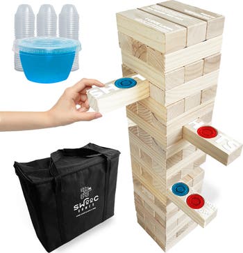 - GIANT TOWER GAME + HIDDEN SHOTS – Pull blocks and throw down gelatin shots! Includes 60 jumbo blocks (6.5 in x 2.3 in x 1.5 in)—40 with commands, 14 with shots, and 6 with DOUBLE shots! It’s a must-have for your next outdoor party.