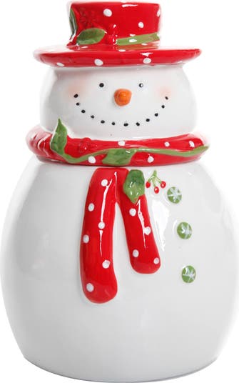 It's the holiday season year round with the Jolly Plenitude 7.5" Snowman Cookie Jar by Gibson Home. This cute and bubbly handpainted cookie jar could not have named better. It's bright colors and friendly face will bring you Christmas joy no matter the season. A stoneware staple with a tight lid for fresh cookies at all times!