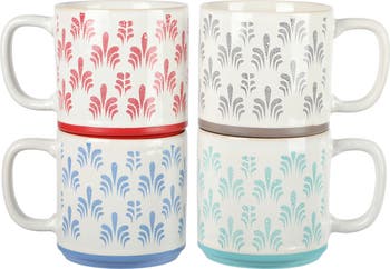 The Morning Mist 4 piece 18oz mug set comes in four assorted colors, perfect for bringing a touch of color into your morning coffee routine. Large 18oz capacity is great for when you need that extra bit of caffeine! Designed with a stackable can shape to help save space on your countertops or in your kitchen cabinets. Allover palm patterned print and colored bottom adds a fun floral touch to each mug, finished with a reactive glaze that makes each design unique. Add a touch of color and pattern to your dishes with this 4 piece set!