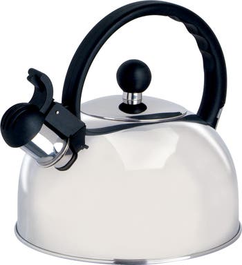 The Springberry 2.25 Qt. Whistling Tea Kettle is made out of high quality 0.4mm stainless steel and features a nylon handle for easy grip and comfort. This sleek whistling tea kettle will add style to your kitchen with its chrome design. You dont need to worry about when the water is boiled, It will whistle when its done. The cool handle make carrying easy off the stove. The tip has a latch for east pour.
