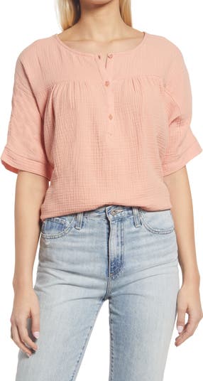 Floaty and lightweight in a cool cotton gauze, this relaxed top features slightly flared dolman sleeves and a curved hem.
