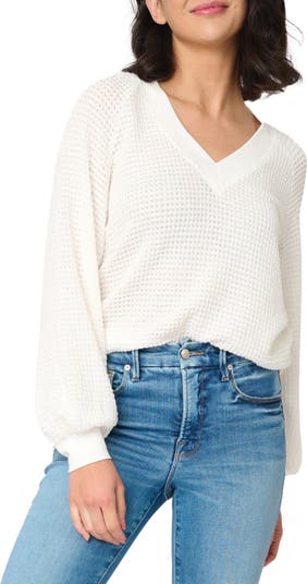 Airy open stitching enlivens this V-neck sweater knit with solid trim.