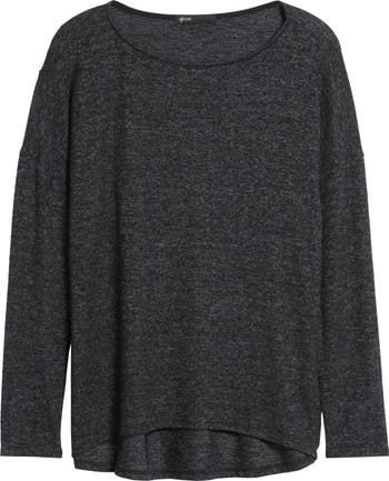 A clavicle-skimming neckline graces a cozy knit pullover in a comfortably swingy cut enhanced with a vented high/low hem.