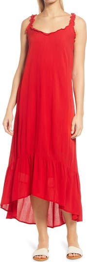 Ruffles trace every edge on this sleeveless maxi in a crinkle-textured weave with a flounced high-low hem.