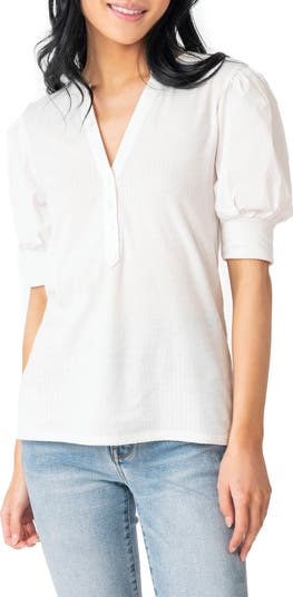 Poplin puff sleeves add volume and charm to this close-fitting henley textured with fine ribbing for contrast and shape.