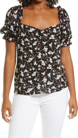Delicate allover blooms enliven this puff-sleeve blouse trimmed with soft ruffles and shaping gathers.