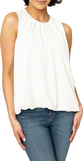 A bubble hem creates a blouson effect in this lightweight and sleeveless crepe top with a keyhole back.