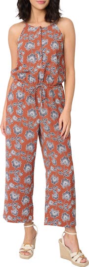 A flowery print covers this tie-waist jumpsuit designed with sleek cutaway shoulders and wide hems.