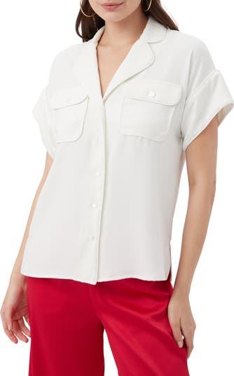 Short sleeve camp style shirt with a full button front, collared neck, front patch pockets and contrast white piping