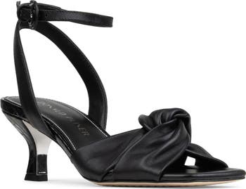 Wide, twisted leather straps create a stunning focal point on a foam-cushioned sandal lifted by a modest heel and secured with an adjustable buckle closure.