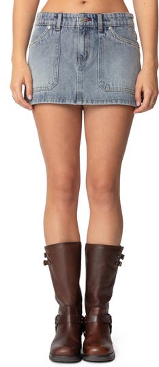 A slightly faded finish enhances the everyday appeal of a nonstretch denim miniskirt that's destined to be an off-duty staple.