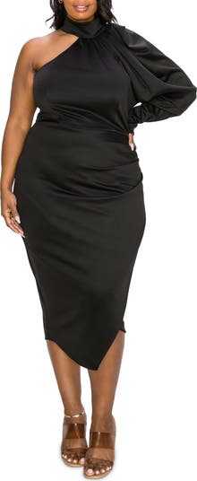 Be party-perfect in this rich satiny midi designed in a shoulder-baring silhouette with a billowy sleeve and a wrapped skirt.