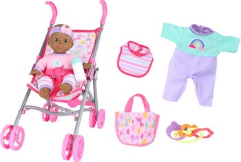 DREAM COLLECTION: 12" BABY DOLL CARE GIFT SET WITH STROLLER - AFRICAN AMERICAN - Take pretend play to a whole new level with the 12-Inch Baby Doll Care Set with Stroller—a delightful, all-in-one play experience for little caregivers! This adorable soft-bodied baby doll comes dressed and ready for love, featuring a vinyl head and hands for realistic touch and hug-ability. The set is packed with essential baby care accessories, including a bib, milk bottle, keychain rattle, extra outfit, and a diaper bag for on-the-go fun. The included baby stroller is lightweight, folds compactly for easy storage, and features double wheels for added stability, allowing your little one to enjoy strolls around the house or even at the park. Designed to encourage imaginative role-play and nurturing skills, this set supports emotional development while offering hours of engaging, hands-on fun. Packaged in a “ready to give” gift box, this environmentally friendly set makes the perfect present—no wrapping required! Ideal for toddlers and preschoolers, it’s the ultimate way to inspire kindness, care, and creativity in young minds.