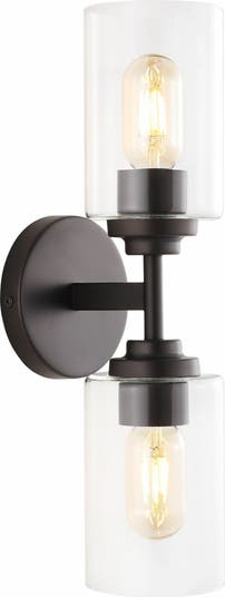 Add vintage flair with our classic industrial-style wall light. Two Edison-style LED bulbs in clear glass cylinders provide plenty of light. Mount this versatile wall sconce horizontally over a sink, or vertically beside a mirror or doorway. Clean lines and a gold finish add rustic-modern touch to your bath vanity, kitchen, hallway or entry.