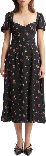 A garden of blooms sweetly dances across a puff-sleeve midi dress that brings one-and-done ease to weekend outings.