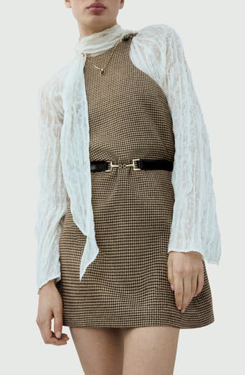 Cut-in shoulders update the style of a microcheck dress cut from a wool-kissed fabric.