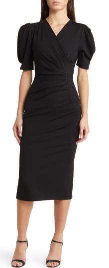 A draped bodice and puffed short sleeves lend the perfect touches of style to this figure-hugging sheath.