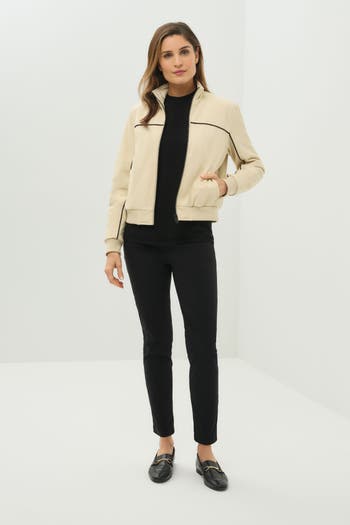 Elevate your summer wardrobe with the Ginger Performance Twill Bomber Jacket. Crafted from lightweight, breathable twill, this jacket offers a refined silhouette perfect for transitional weather. Its sleek design combines modern performance and a sleek black piping detail make this jacket perfect for all adventures.