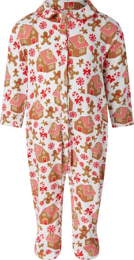 This soft cotton footie in ivory is adorned with charming gingerbread print , perfect for your little one's daily naps, family strolls, and festive adventures. Featuring a classic Peter Pan collar and cosy footies, it keeps tiny toes warm and snug. The snap fastening at the front makes dressing quick and easy, so your playful baby can get back to exploring in no time.