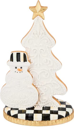 Sweeten your holiday setup with this handmade gingerbread-inspired figurine. Topped with a golden star and perched on a checked base, the frosted snowman and tree bring a festive yet whimsical charm to any space.