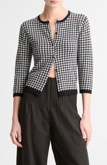 This timeless gingham-check cardigan is knit from an Italian blend featuring wool and cotton that boasts crisp texture and a light, transitional weight ideal for the shift into the warmer months.